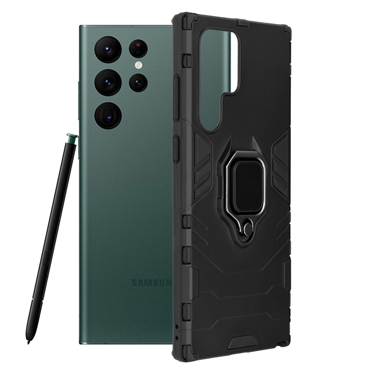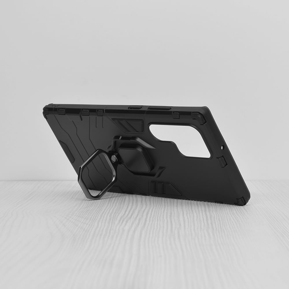Husa de protectie Techsuit Shield Ring pentru Samsung Galaxy S22 Ultra este fabricata din silicon TPU si plastic dur, avand amplasat pe partea din spate un inel de sustinere metalic ce are rol si de suport birou.