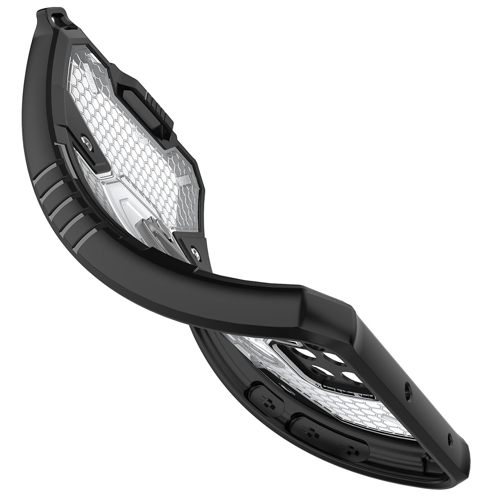 Husa prezinta un design hexagonal inedit, combinand partea flexibila specifica TPU cu cea rigida datorata policarbonatului din componenta.